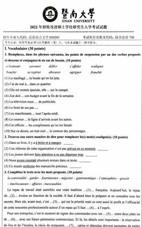 近日,暨南大学公布了2022专业课考研真题,给有意向报考的考生们提供了十分重要的备考资料,正值暑假黄金备考期,各位考生要认真答题,一方面检验现阶段备考效果,另一方面了解其出题形式及考查重点,以下是(官方版)暨南大学2022年考研真题:730综合法语,供参考。