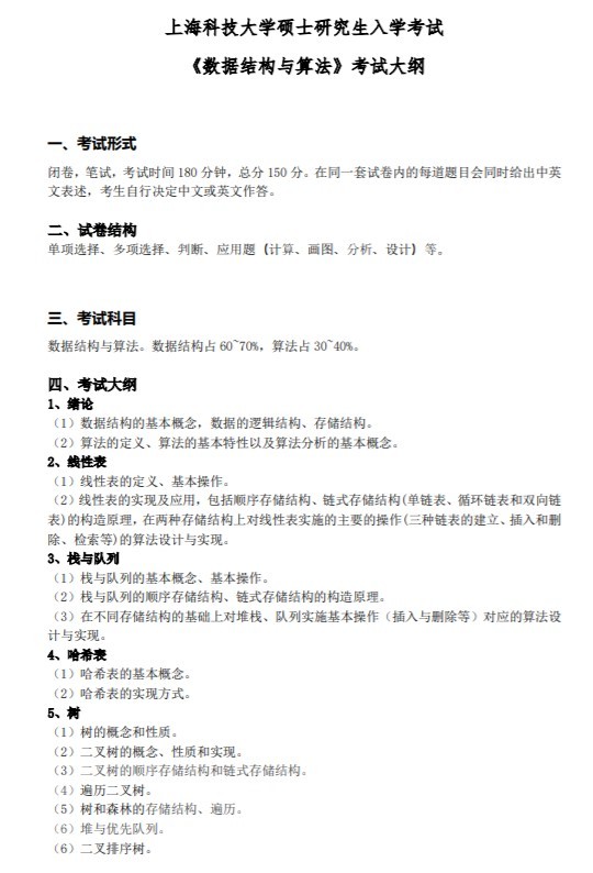 考研大纲对同学们考试备考具有指导意义,考研大纲规定了考试科目的考试范围、考试要求、考试形式以及试卷结构,大纲是考研的重点所在,也是备考复习的依据。小编为大家梳理了上海科技大学硕士研究生入学考试数据结构与算法考试大纲,快来看看吧。