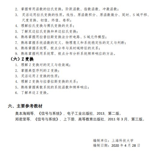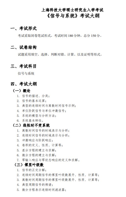 上海科技大学2021硕士研究生招生信号与系统考试大纲