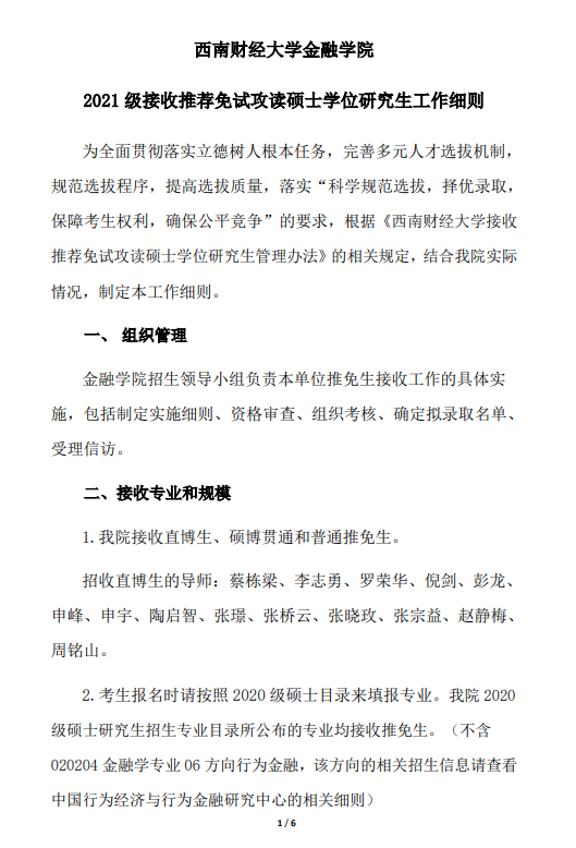 为全面贯彻落实立德树人根本任务,完善多元人才选拔机制,规范选拔程序,提高选拔质量,落实“科学规范选拔,择优录取,保障考生权利,确保公平竞争”的要求,根据《西南财经大学接收推荐免试攻读硕士学位研究生管理办法》的相关规定,结合我院实际情况,制定本工作细则。