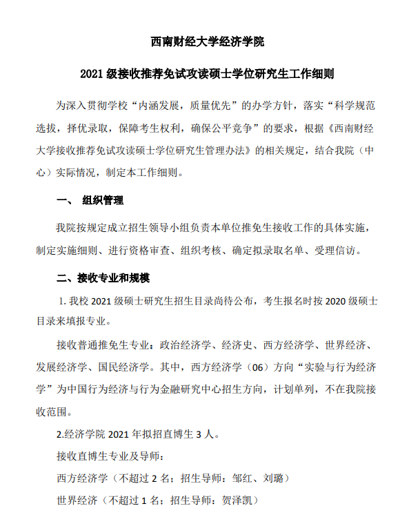 为深入贯彻学校“内涵发展,质量优先”的办学方针,落实“科学规范选拔,择优录取,保障考生权利,确保公平竞争”的要求,根据《西南财经大学接收推荐免试攻读硕士学位研究生管理办法》的相关规定,结合我院(中心)实际情况,制定本工作细则。