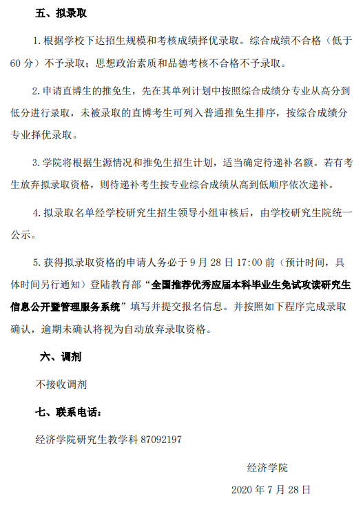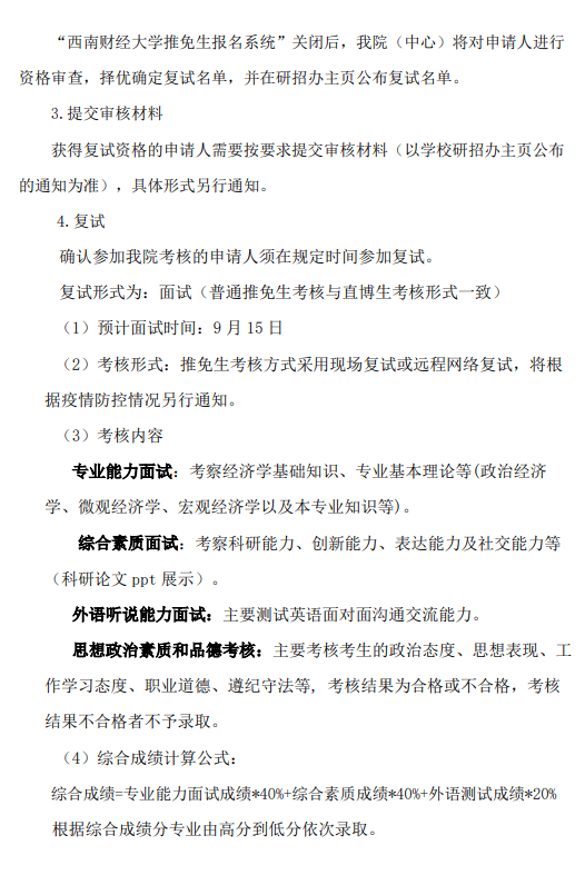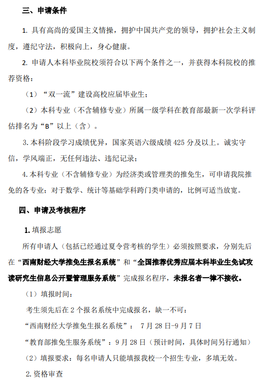 推免生,全称“推荐优秀应届本科毕业生免试攻读硕士学位研究生”,是指可以不用参加研究生考试而直接读研的一种情形,换句话来说也就是我们平常所说的保研。推研按时间排序是:交叉、本系直博、本系直硕、外推、工硕。每年推研的时间为大四上学期9月初到9月末。今天小编为大家整理了2021西南财经大学经济学院推免生招生细则。