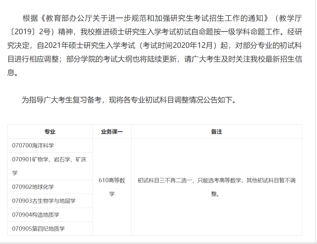 中国地质大学(北京)2021年研招初试科目调整通知:海洋科学、矿物学、岩石学、矿床学、地球化学、古生物学与地层学、构造地质学、第四纪地质学业务课一为高等数学。初试科目三不再二选一,只能选考高等数学,其他初试科目暂不调整。