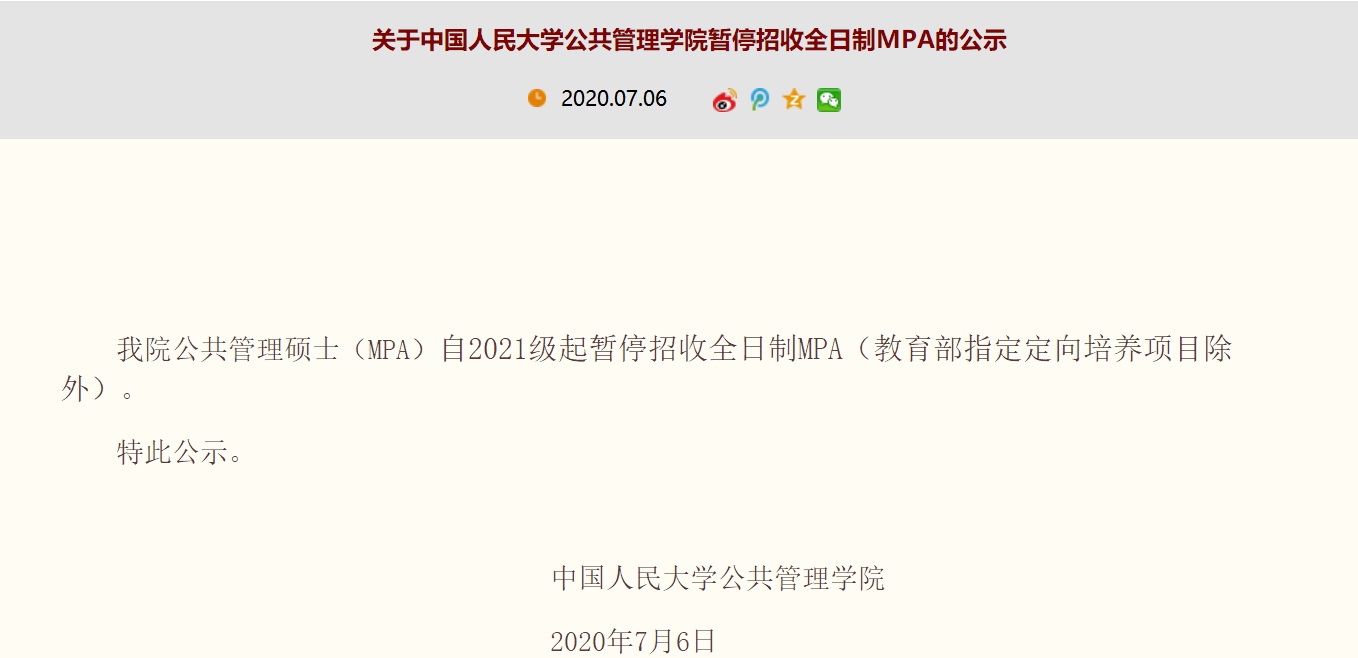 中国人民大学公共管理学院自2021级起暂停招收全日制MPA的通知:中国人民大学公共管理硕士(MPA)自2021级起暂停招收全日制MPA(教育部指定定向培养项目除外)。