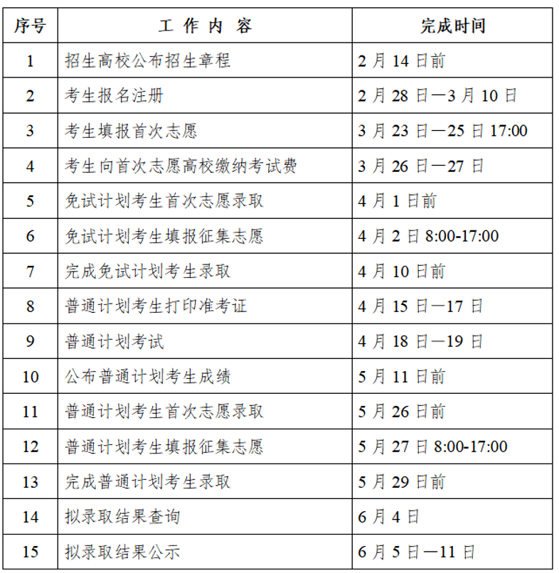 (一)免试计划录取。免试计划录取工作在普通计划考试开考前(4月上旬)完成。招生高校根据测试成绩,结合考生志愿、招生计划等情况综合评价,择优录取。荣立个人三等功及以上荣誉的考生可优先录取。