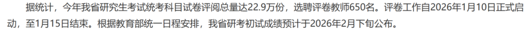 全省考研评卷工作于1月10日启动,1月15日正式结束,统考科目试卷共计22.9万份,650名教师参与评卷工作,全程规范操作、严格保密,保障评卷工作顺利落幕。