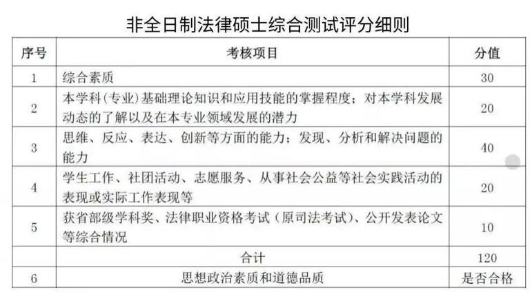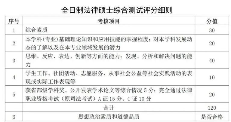 综合测试(120 分 -10 分钟):全日制法律硕士中,通过法律职业资格考试(A 证 15 分、C 证 10 分)加分力度大,非全日制则侧重实务工作表现;