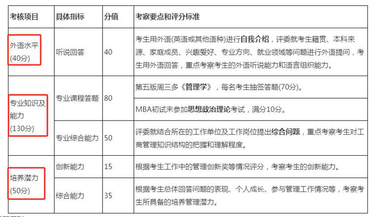 培养潜力单独计分:创新能力(15 分)、综合管理潜力(35 分),在职考生的工作创新经历、管理经验成为加分亮点。