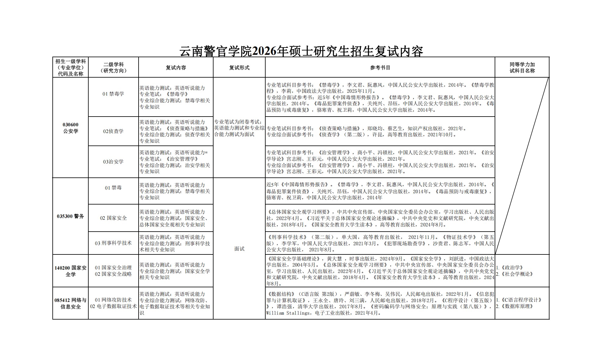 云南警官学院2026年考研复试内容