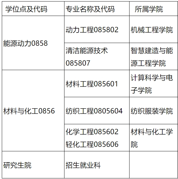 经一志愿复试,我校2026年研究生招生能源动力学位点下设的动力工程(085802)、清洁能源技术(085807)专业,材料与化工学位点下设的材料工程(085601)、化学工程(085602)、纺织工程(085604)、轻化工程(085606)专业均有调剂名额。现将我校2026年硕士研究生招生调剂相关事项公告如下。