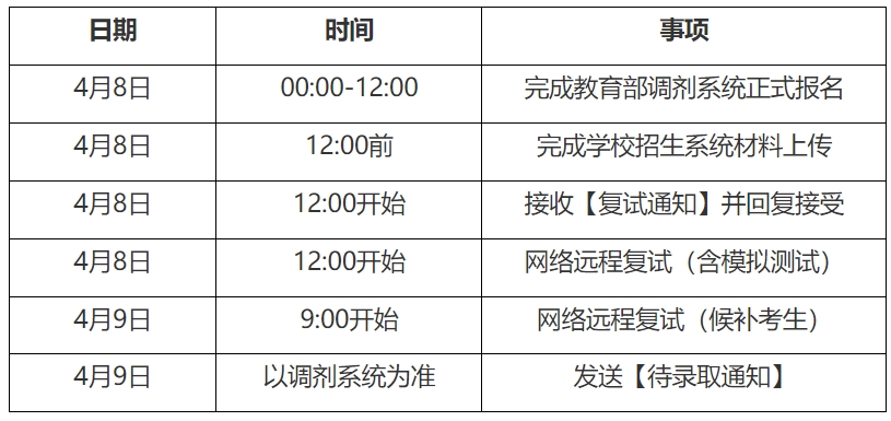 教育部调剂系统开放12小时后(4月8日12:00起),对符合我校调剂要求的考生择优发送【复试通知】(含复试须知及腾讯会议信息)。