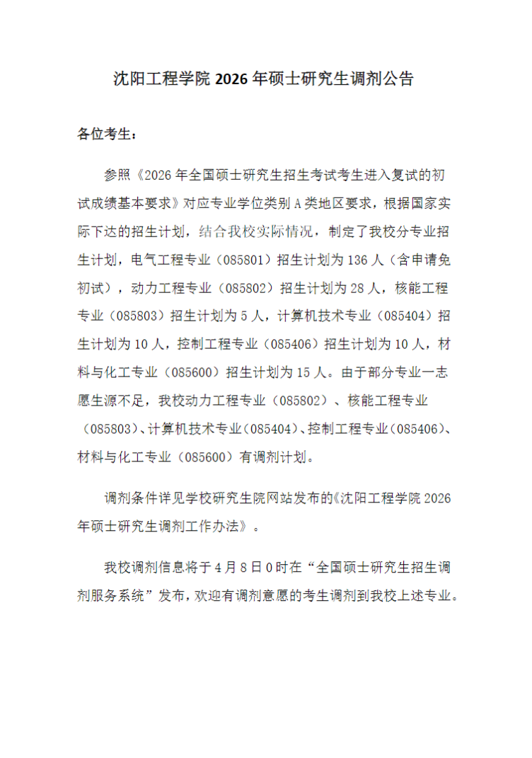 调剂黄金期,信息就是竞争力!启航考研为2026考研考生整理了全国各省市院校最新调剂公告合集,覆盖多所高校调剂专业、申请条件、系统开放时间等核心信息,帮你省去逐一检索的繁琐,快速锁定适配院校。下面带来沈阳工程学院2026年硕士研究生调剂公告。