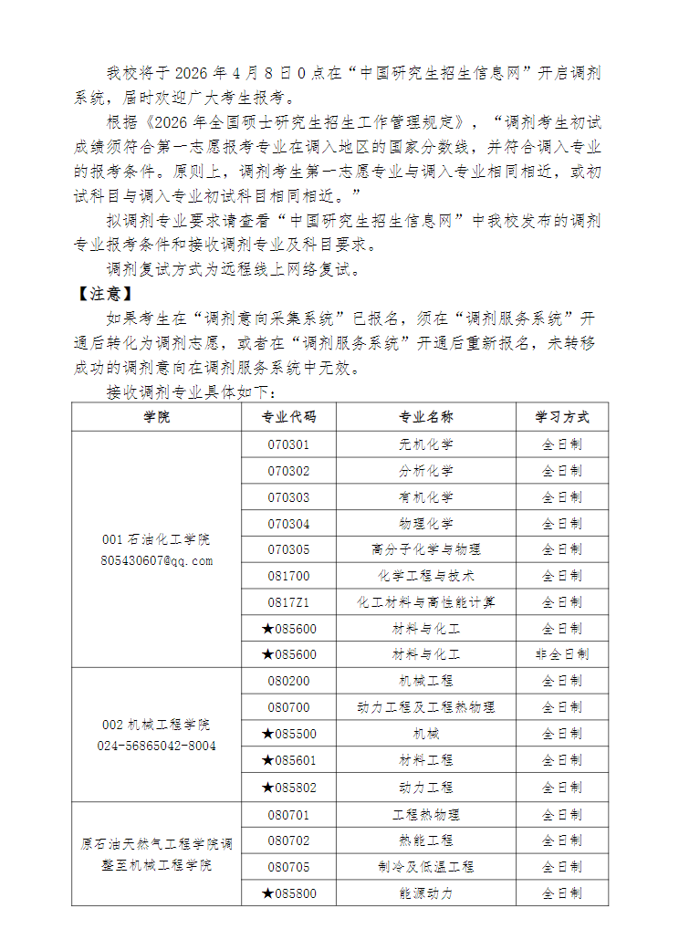 调剂黄金期,信息就是竞争力!启航考研为2026考研考生整理了全国各省市院校最新调剂公告合集,覆盖多所高校调剂专业、申请条件、系统开放时间等核心信息,帮你省去逐一检索的繁琐,快速锁定适配院校。下面带来辽宁石油化工大学2026年硕士研究生招生拟调剂专业。