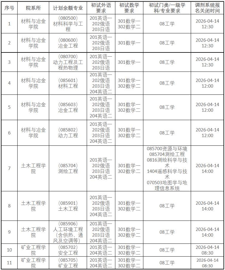我校目前下列学科专业(全日制)尚有一定数量的调剂余额,欢迎广大考生登录中国研究生招生网2026年全国硕士研究生招生“调剂服务系统”报考。本公告实时更新,敬请关注。