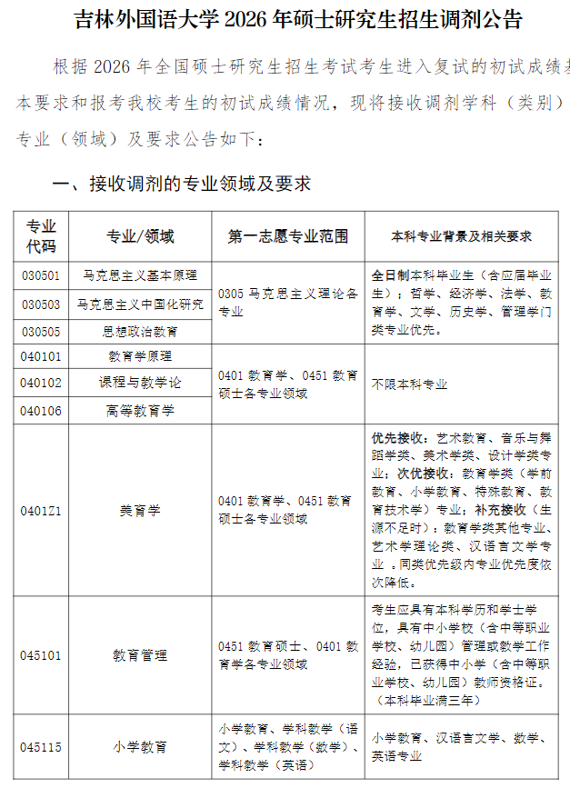 一志愿没有上岸也别放弃,调剂依然是通往研究生的重要途径。下面为大家带来吉林外国语大学2026年硕士研究生招生调剂公告。