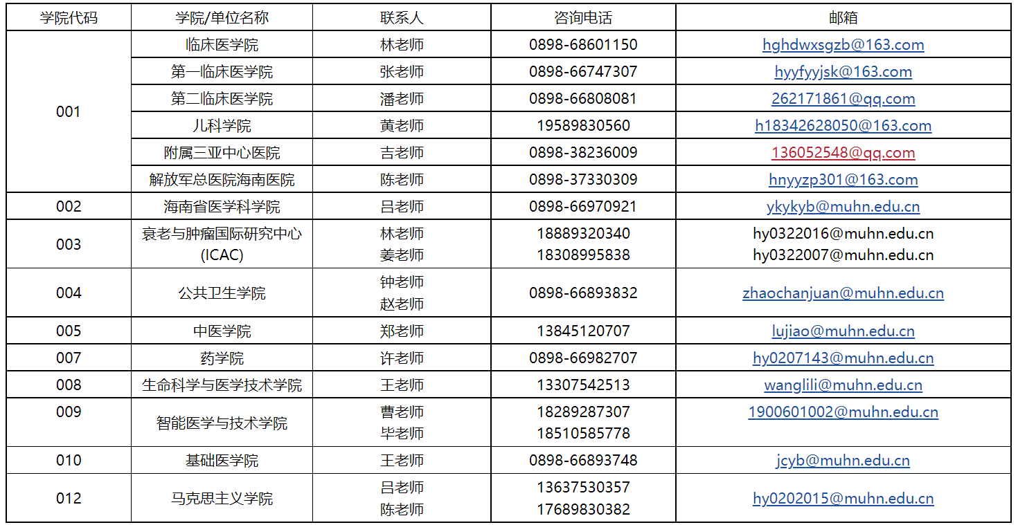各二级招生单位咨询方式详见下表(欢迎在8:00—12:00、15:00—18:00工作时间段内电话咨询)。