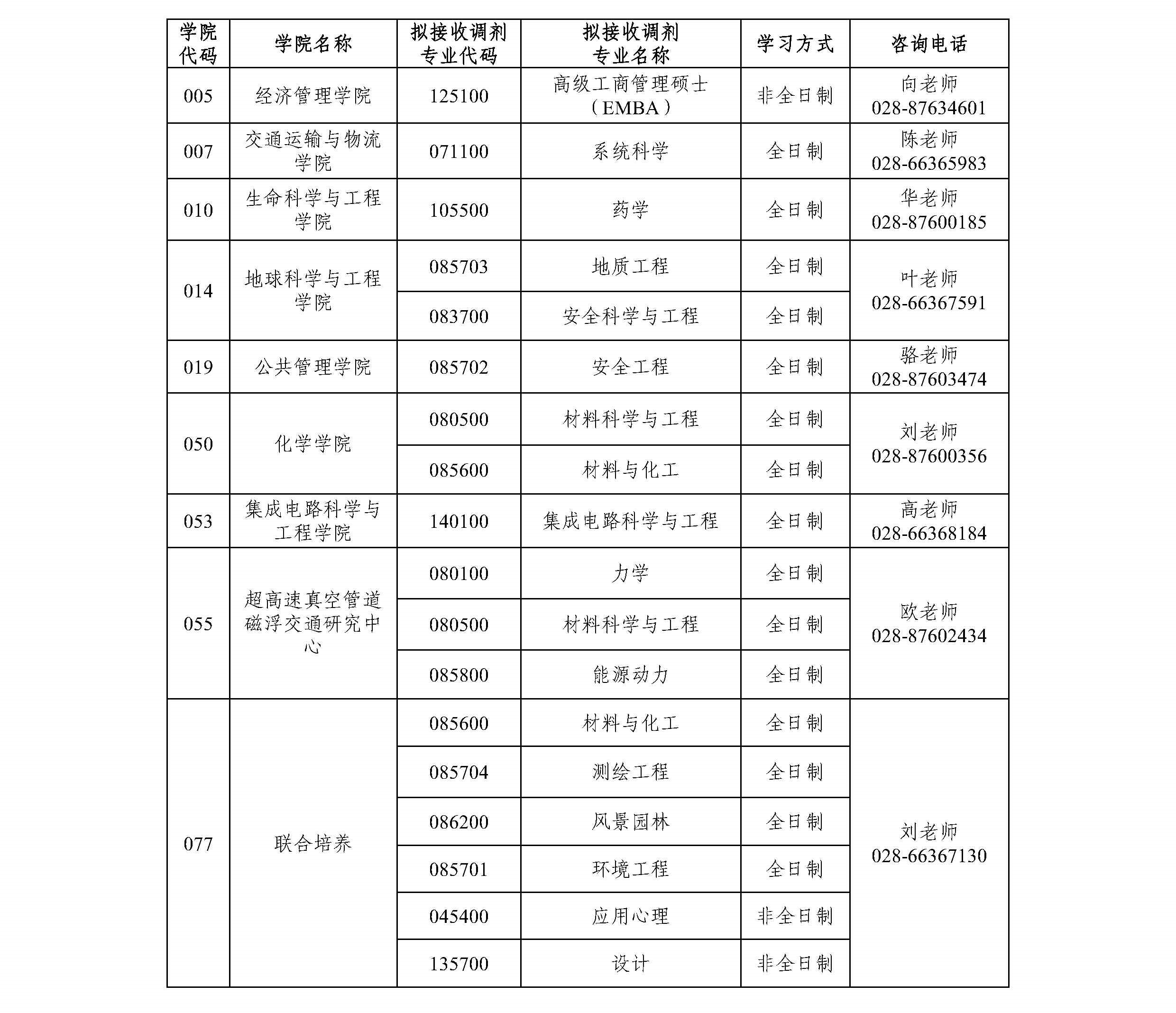 我校硕士研究生调剂信息均以中国研究生招生信息网发布的最终信息为准。所有考生调剂申请均须通过教育部“全国硕士生招生复试调剂服务系统”(网址:https://yz.chsi.com.cn/yztj)进行,不受理其它方式调剂。各专业调剂系统具体开放时间、各专业调剂缺额和要求将在“全国硕士生招生复试调剂服务系统”中公布,复试录取办法等请以西南交通大学各学院官网发布为准,请考生及时关注。